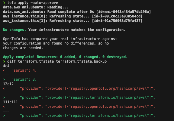 tofu를 이용하여 배포를 수행한 후 tfstate와 tfstate.backup을 비교해 보면 다음과 같이 serial 카운트가 올라가고, provider가 terrafrom에서 openTofu로 변경된 것을 확인할 수 있습니다.