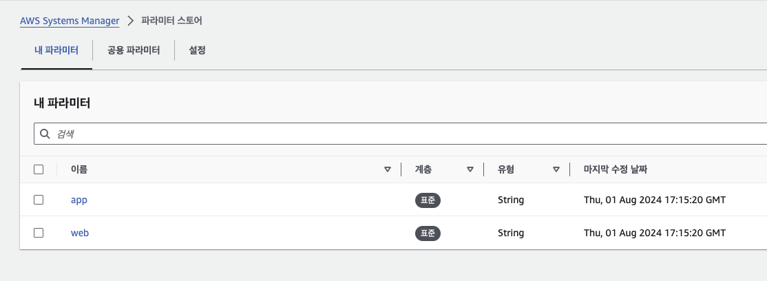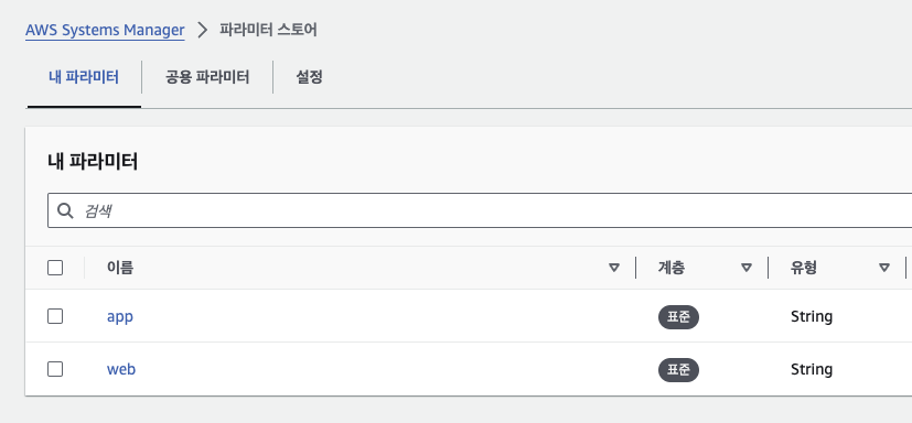다음과 같이 기존 2개의 리소스와 신규 2개의 파라미터 스토어 리소스가 잘 생성된 것을 확인할 수 있습니다.