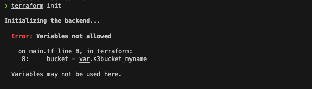 기존 terraform.backend에서는 variable 변수 사용할 수 없었습니다. variable 변수를 사용할 경우 terraform init 과정에서 백엔드가 초기화되어야 하기 때문에 에러가 발생하게 되는 상황이 발생합니다.