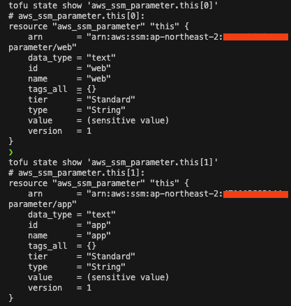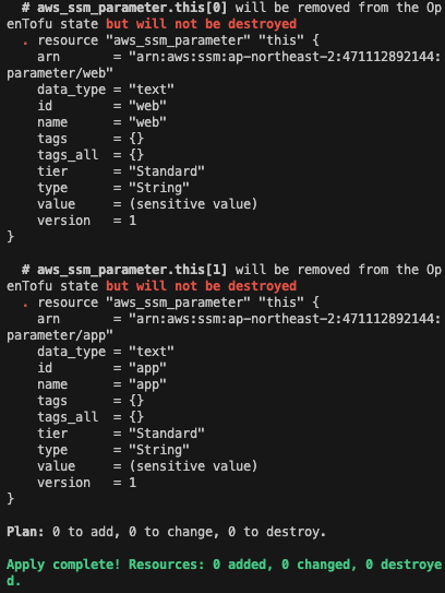 tofu state ls로 확인을 해보면 tfstate에서 삭제되었지만, 파라미터 스토어에는 여전히 존재하는 것을 확인할 수 있습니다.