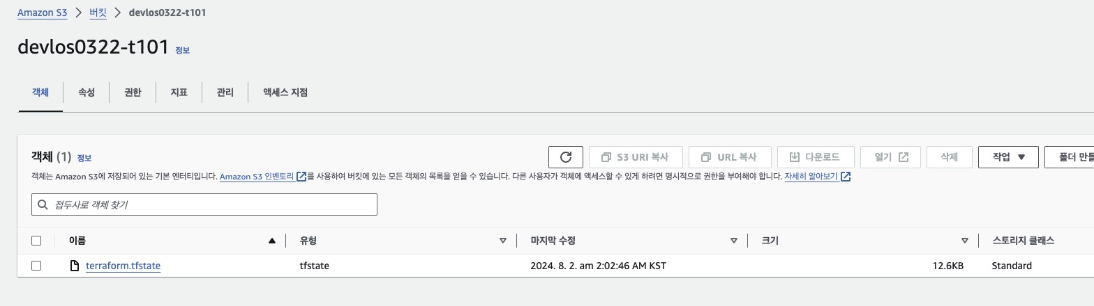 리소스를 생성하면 버킷에 state가 잘 생성되는 것을 확인할 수 있었습니다.