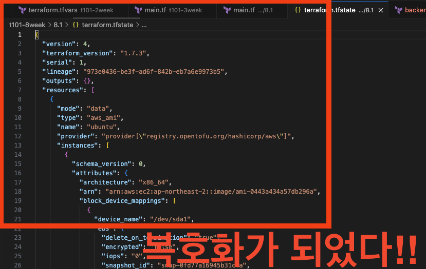 Apply를 수행하면 KMS를 이용하여 암호화된 tfstate 파일이 s3 버킷에 잘 관리되고 있음을 확인할 수 있습니다.