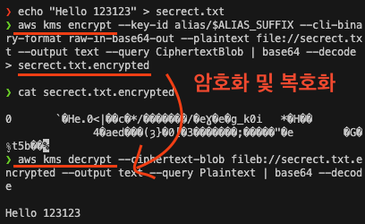 생성된 KMS 키를 통해 텍스트 파일의 암호화 복호화를 수행한 결과는 다음과 같았습니다.