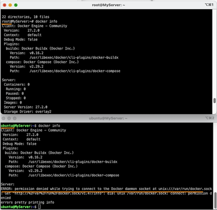 root 유저와 일반(ubuntu) 유저를 통해 docker 명령어를 실행해 보면 일반 유저가 unix socket 정보를 확인할 수 없기 때문에 다음과 같이 에러가 발생합니다.