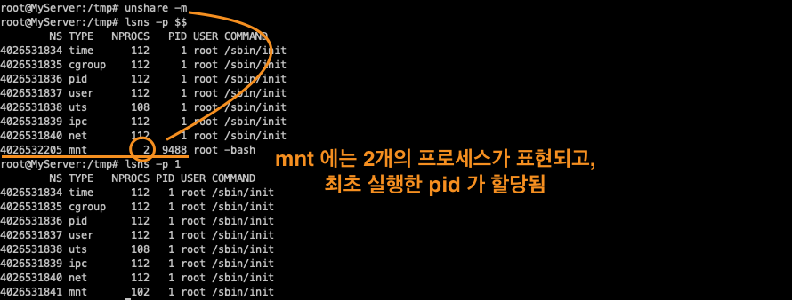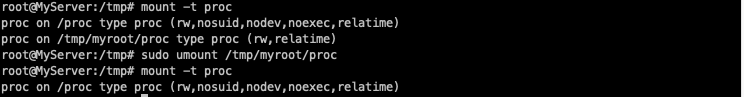 | findmnt /proc | /proc 파일 시스템의 마운트 정보를 찾고, 해당 파일 시스템의 타겟, 소스, 파일 시스템 타입, 옵션 등을 출력합니다. |