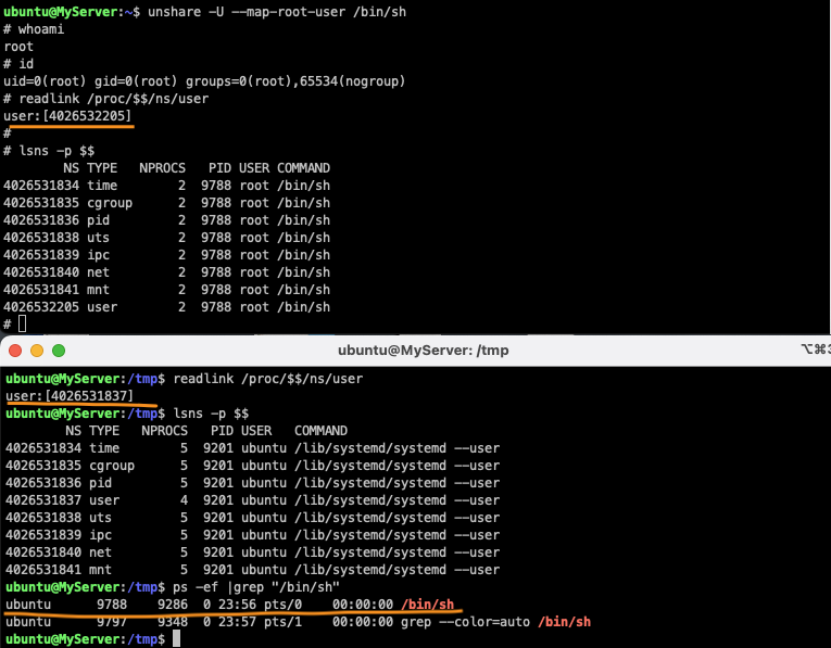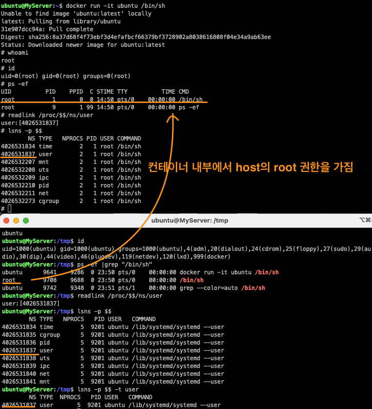 다음과 같이 container에서는 root로 실행되지만, host에서는 ubuntu로 확인이 됩니다.