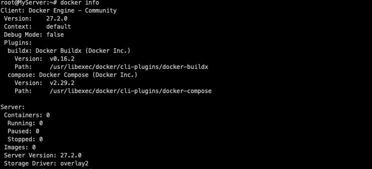 # 도커 정보 확인 : Client 와 Server , Storage Driver(overlay2), Cgroup Version(2), Default Runtime(runc)