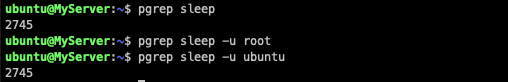 | pgrep sleep -u ubuntu | 사용계정이 "ubuntu"이고 이름이 "sleep"인 프로세스를 검색하여 해당 프로세스의 PID를 출력합니다. |