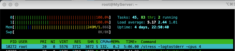 docker run -d --cpu-shares 512 --name cpu2 vish/stress -cpus "4"