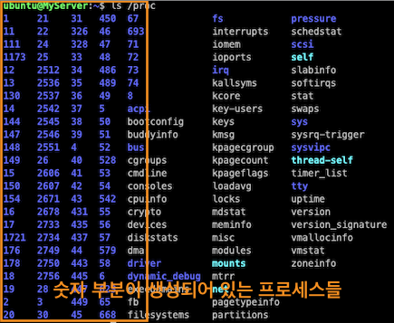 | ls /proc | /proc 디렉터리 이하에 프로세스와 연관된 가상 파일시스템 내용을 확인할 수 있음 |