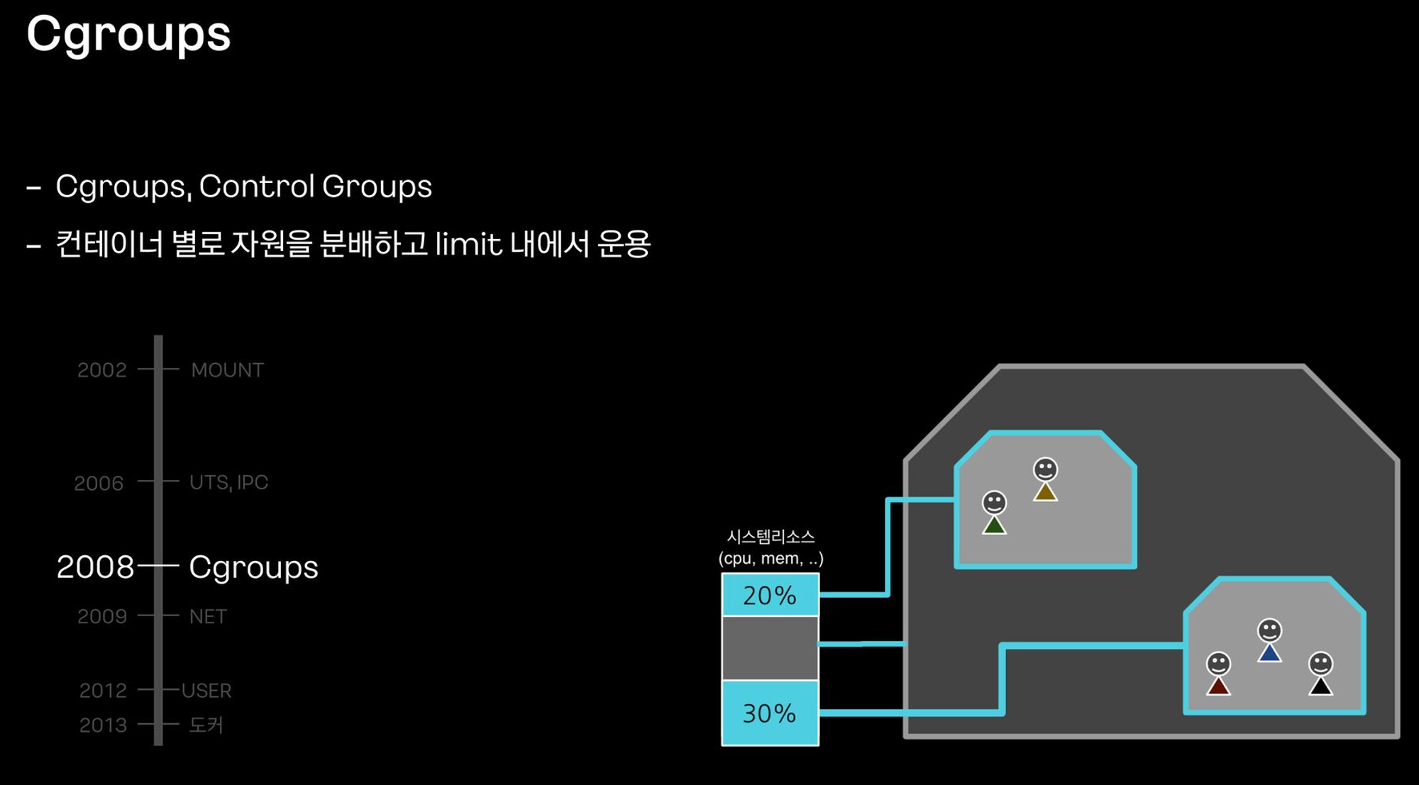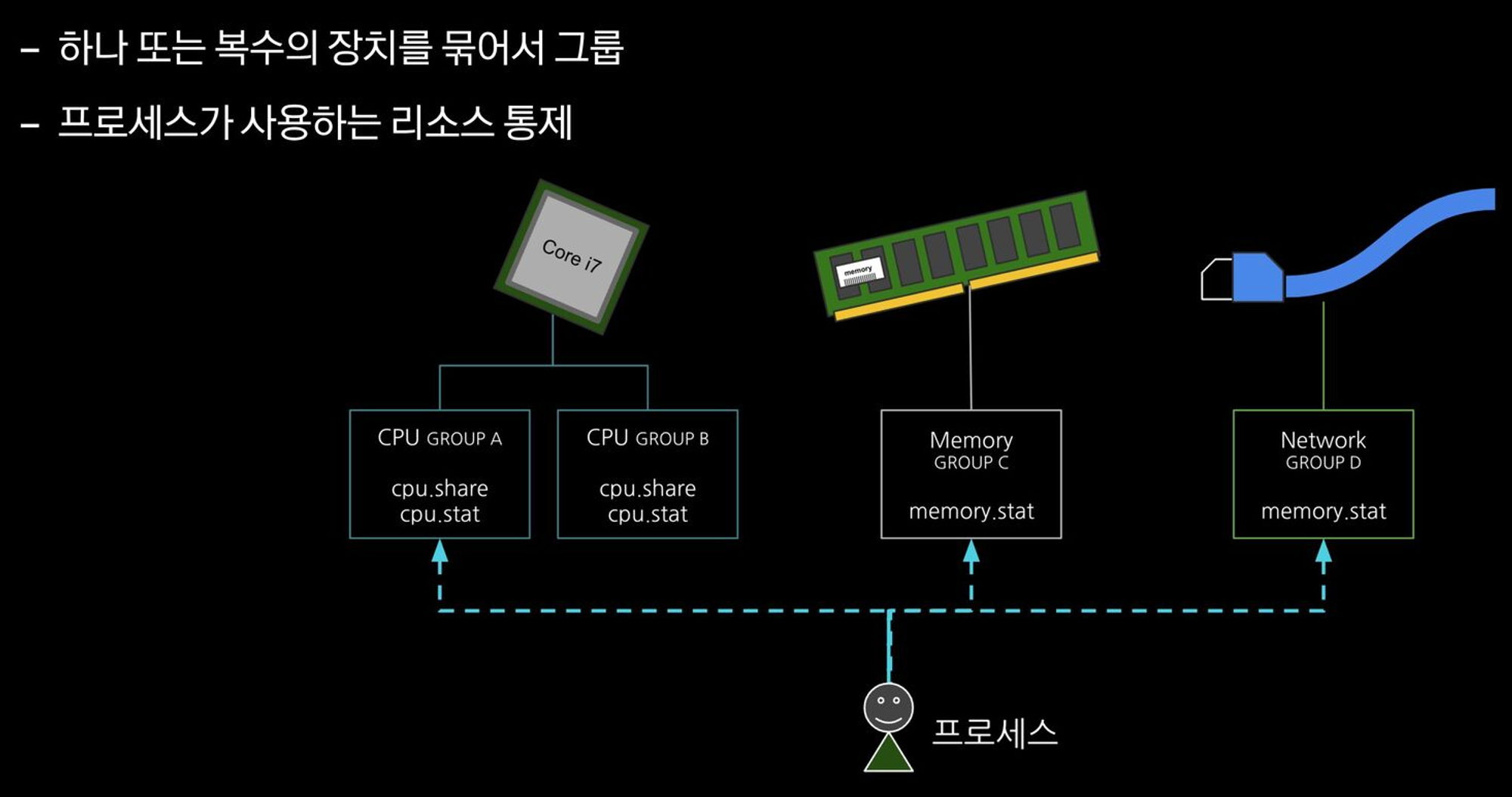 cgroup은 host의 다양한 자원(CPU, Disk I/O, Memory, Network 등) 사용을 제한/격리시키는 커널 기능입니다.