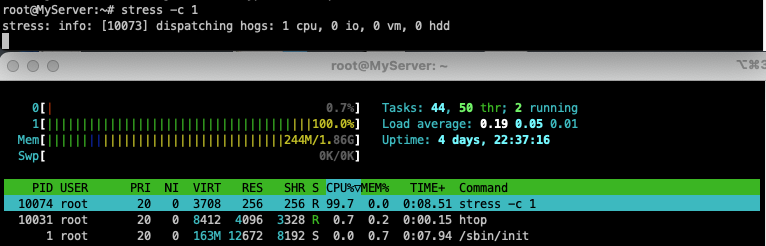 # 터미널2 : 아래 stress 실행 후 CPU 사용률 확인
