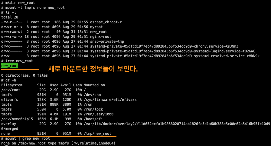 | mount -t proc | 프로세스 파일 시스템(proc)을 마운트합니다. 보통 시스템이 부팅될 때 자동으로 마운트됩니다. |