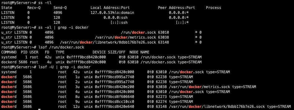 아래의 실습을 통해 인스턴스에서 사용하고 있는 tcp 소켓과 unix 소켓 정보를 확인해 봅니다.