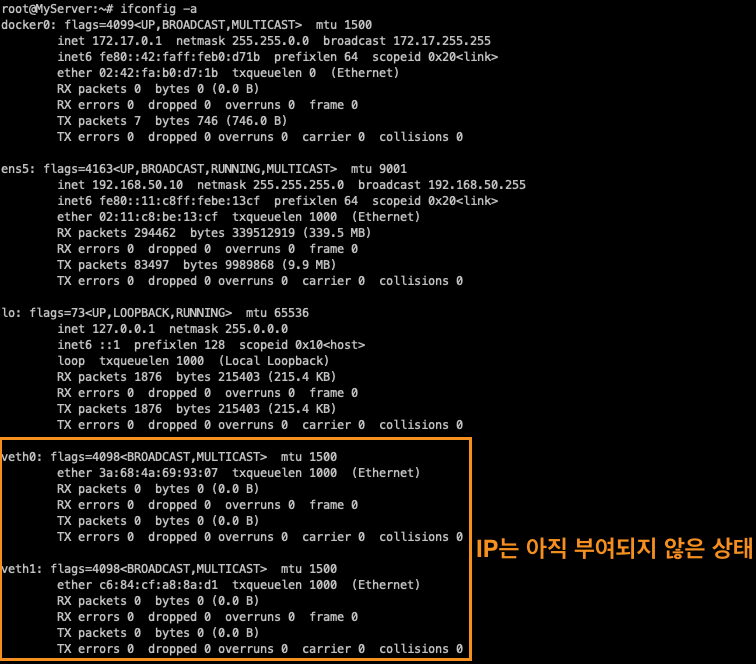 다음으로 각 veth에 IP를 할당하고, 활성화 상태로 만듭니다.