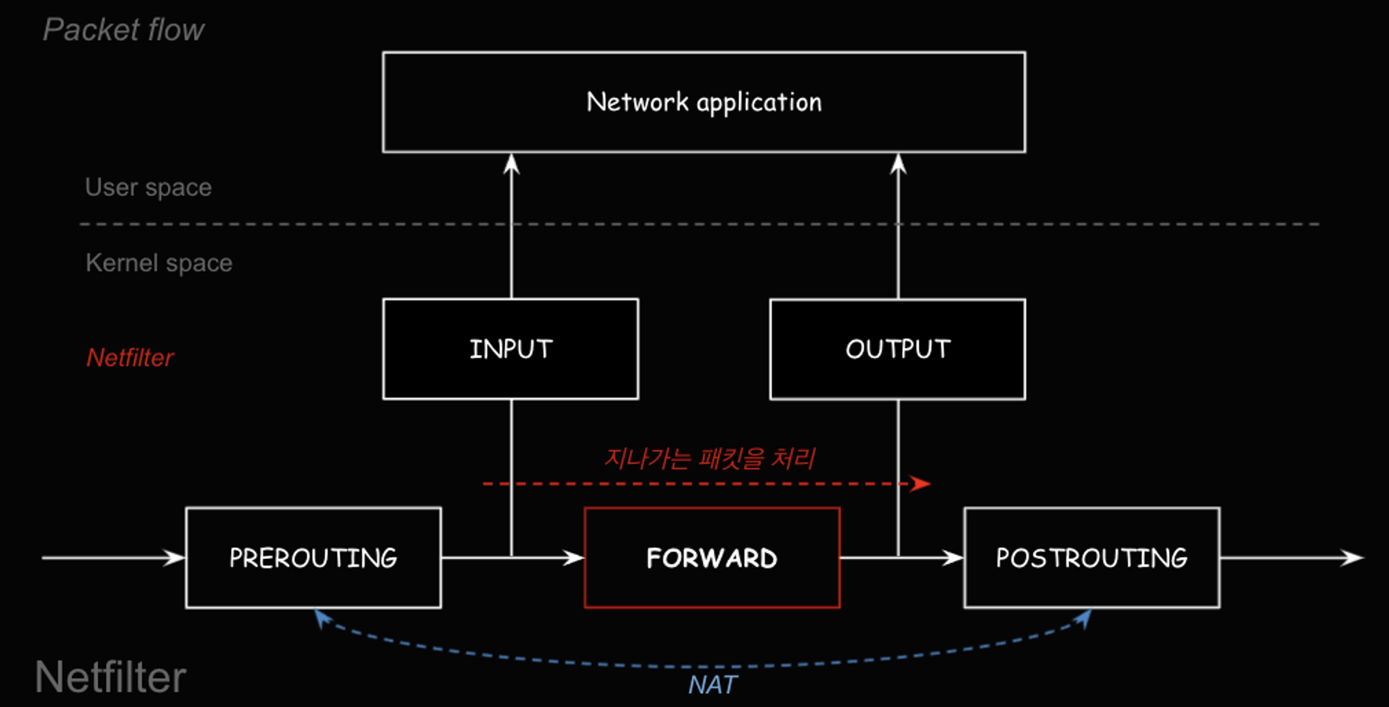## POSTROUTING : 라우팅 Outbound or 포워딩 트래픽에 의해 트리거되는 netfilter hook