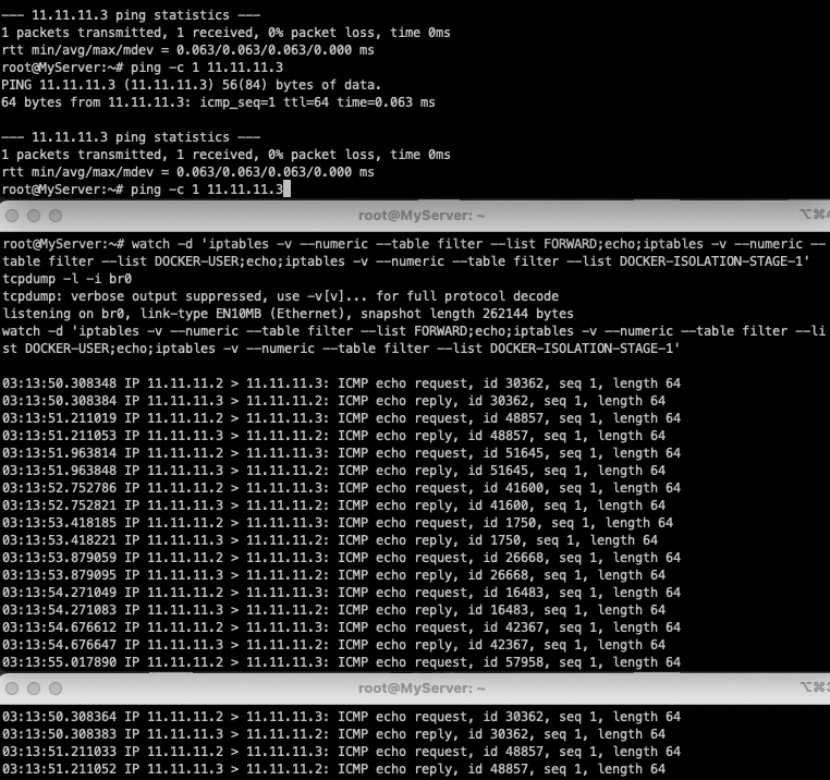watch -d 'iptables -v --numeric --table filter --list FORWARD;echo;iptables -v --numeric --table filter --list DOCKER-USER;echo;iptables -v --numeric --table filter --list DOCKER-ISOLATION-STAGE-1'