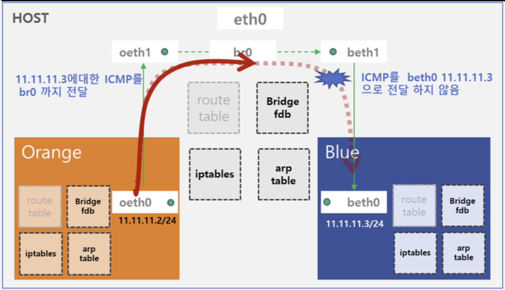 1.2 RED ← Bridge(br0) → BLUE 간 통신
