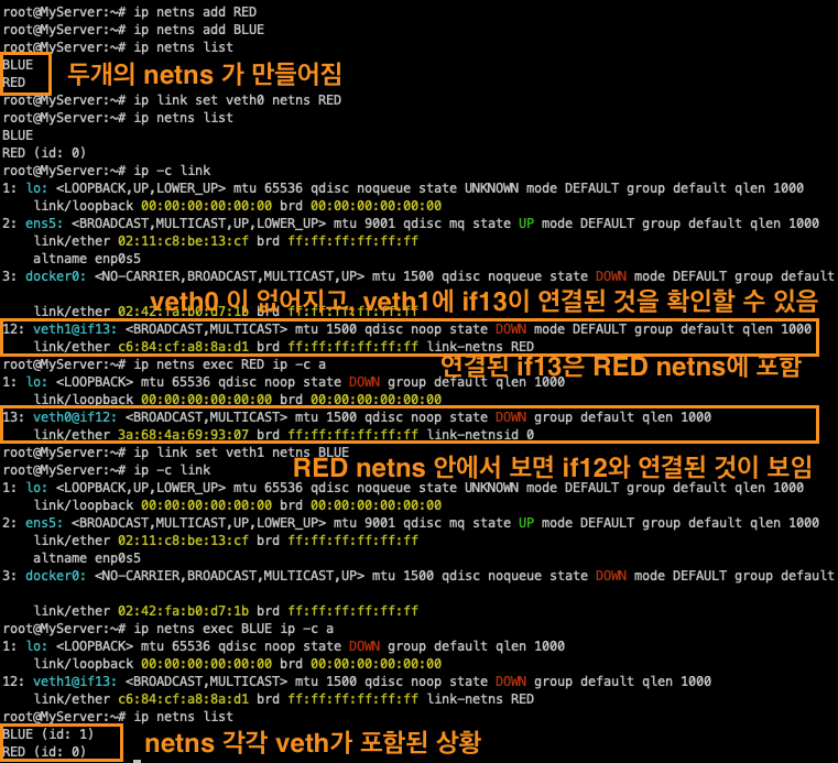 다음으로 네트워크 네임스페이스를 생성하고, veth들을 namespace로 집어넣습니다.