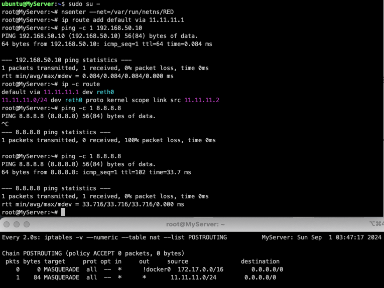 iptables 명령어를 사용하여 NAT(Network Address Translation) 테이블의 POSTROUTING 체인에 MASQUERADE 규칙을 추가하면 이 규칙은 출발지 IP가 11.11.11.0/24 네트워크 대역에 속하는 패킷의 출발지 IP를 현재 시스템의 eth0 IP로 변환되어 통신이 가능해집니다.