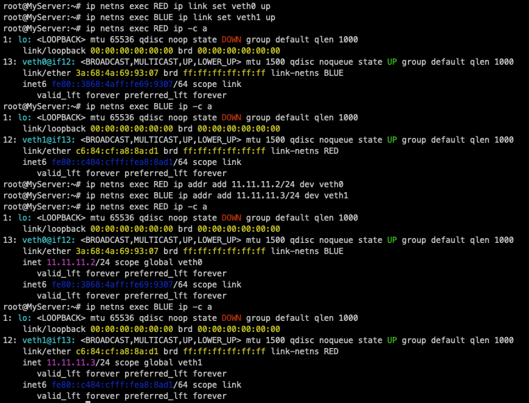 ip netns exec RED ip addr add 11.11.11.2/24 dev veth0