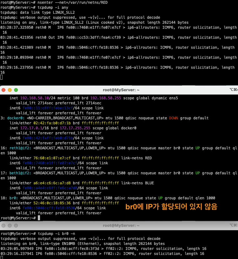 호스트에서 컨테이너로 통신을 연결할 경우 br0에 IP가 없으면 통신이 안됩니다.