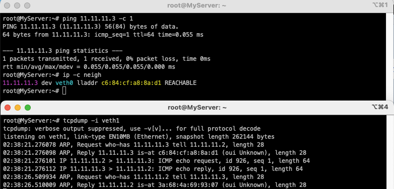 마지막으로 두개의 veth를 이용하여 통신이 되는지 확인해 봅니다.