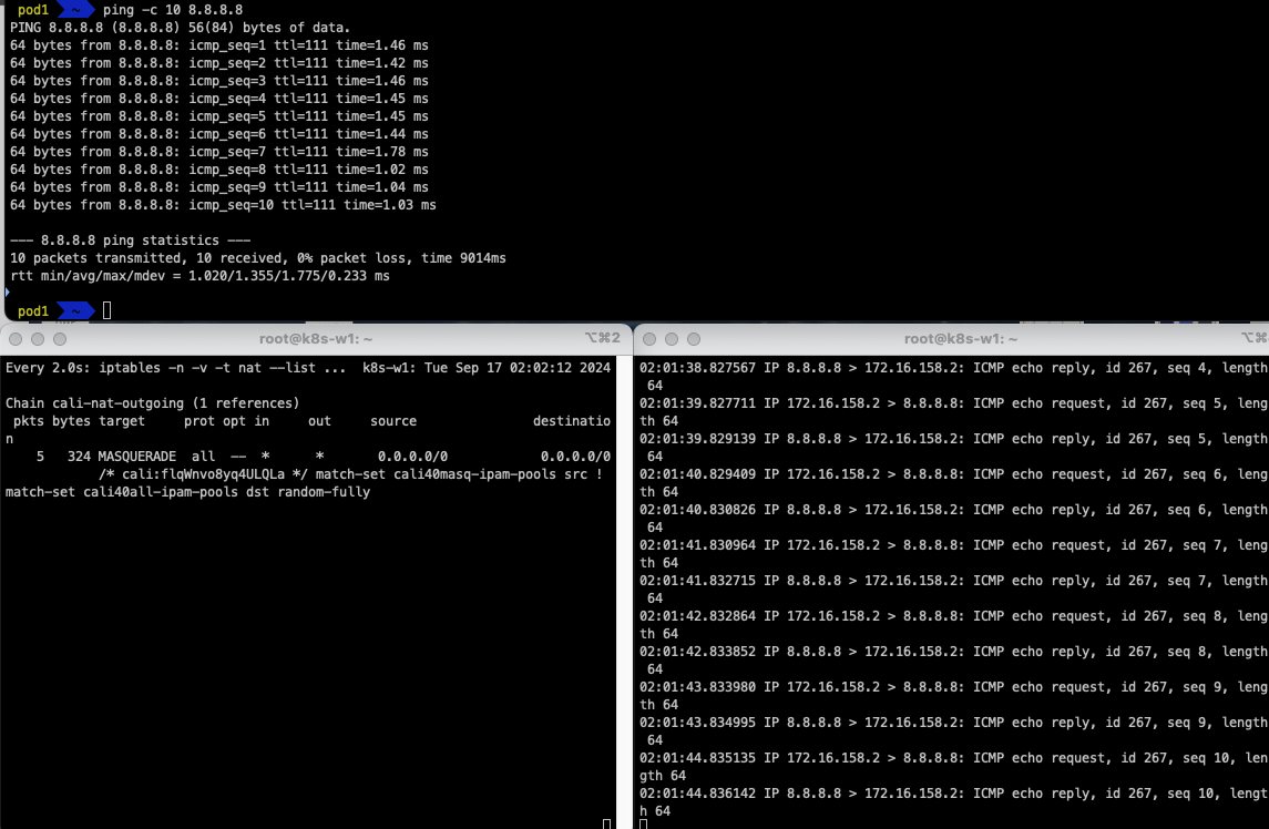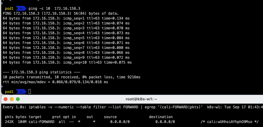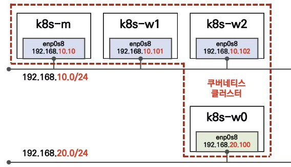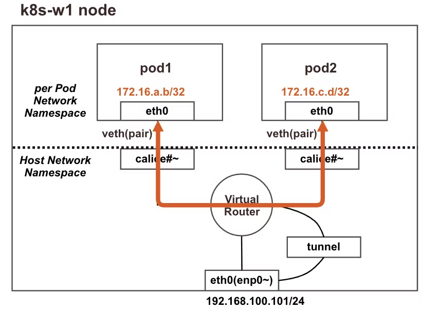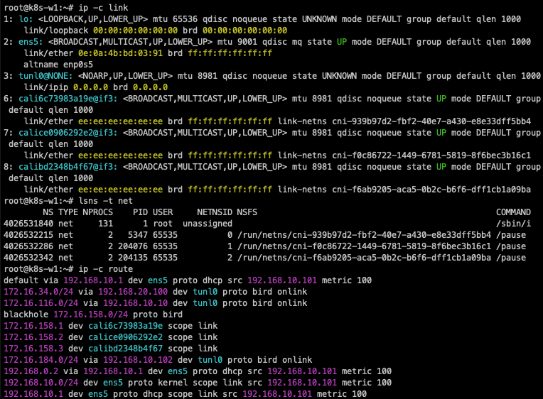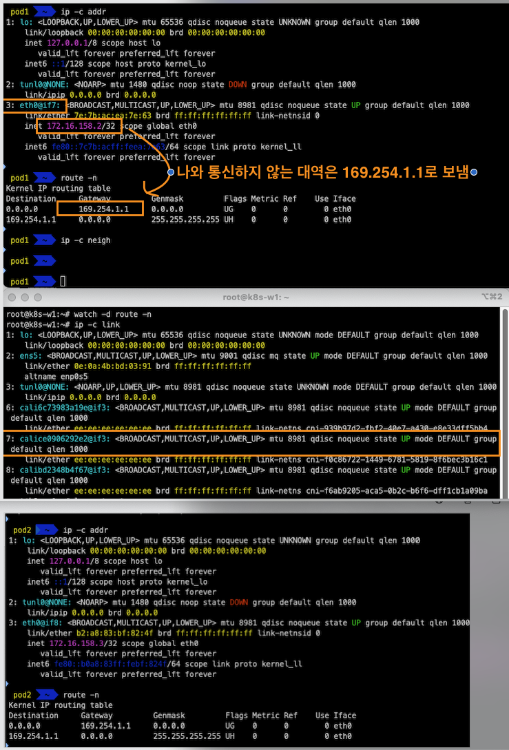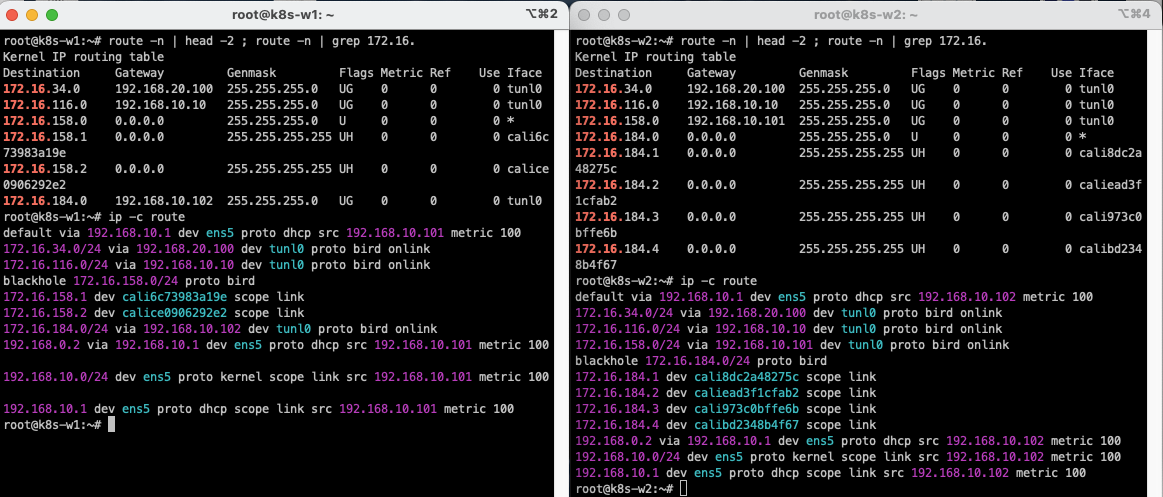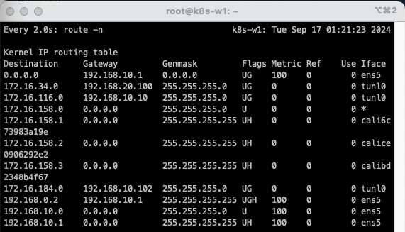 이는 172.16.158.0/24 대역의 Pod와 통신하려면, 192.168.10.101(k8s-w1)로 찾아가고, 172.16.184.0/24 대역의 Pod와 통신하려면 192.168.10.102(k8s-w2)로 찾아가라는 의미입니다.