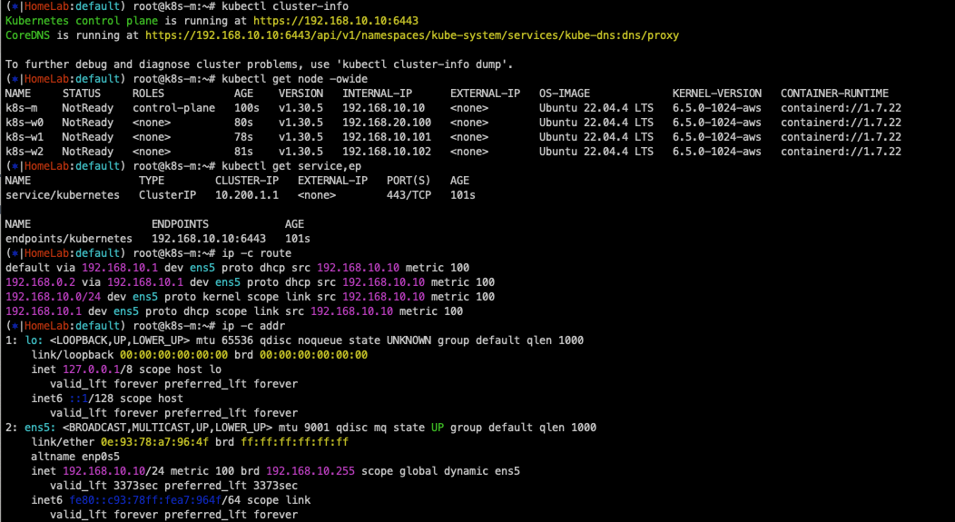 CNI가 설치되어 있지 않아 인스턴스들의 상태가 NotReady 상태로 되어 있는 것을 확인할 수 있습니다.