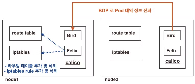 각 노드에 파드 네트워크 대역은 BIRD를 통해 BGP로 전파되며, felix에 의해 호스트 라우팅 테이블에 자동으로 업데이트됩니다.