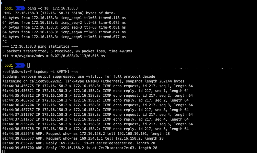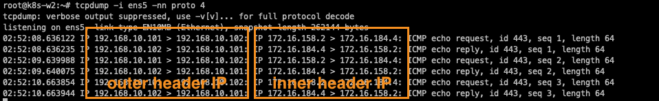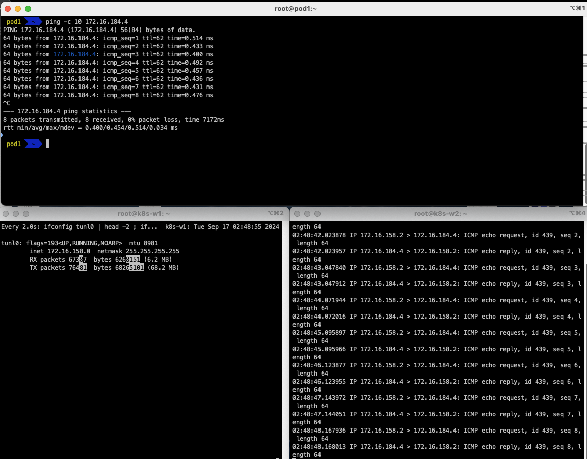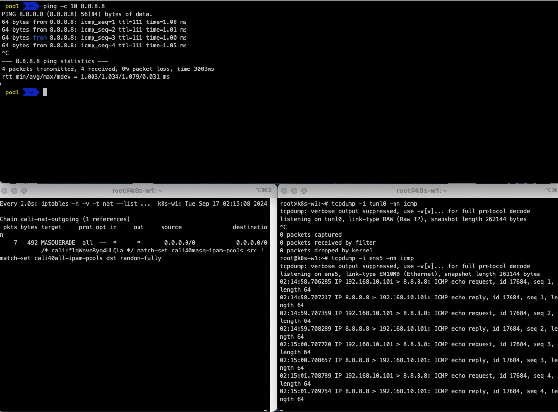 tunl0과 eth0에 tcpdump를 걸고, Pod1에서 Pod2로 ping을 보낼 때의 패킷의 흐름을 확인합니다.