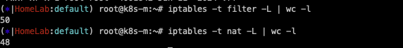 iptable의 필터와, nat 개수가 각각 50, 48개를 확인합니다.