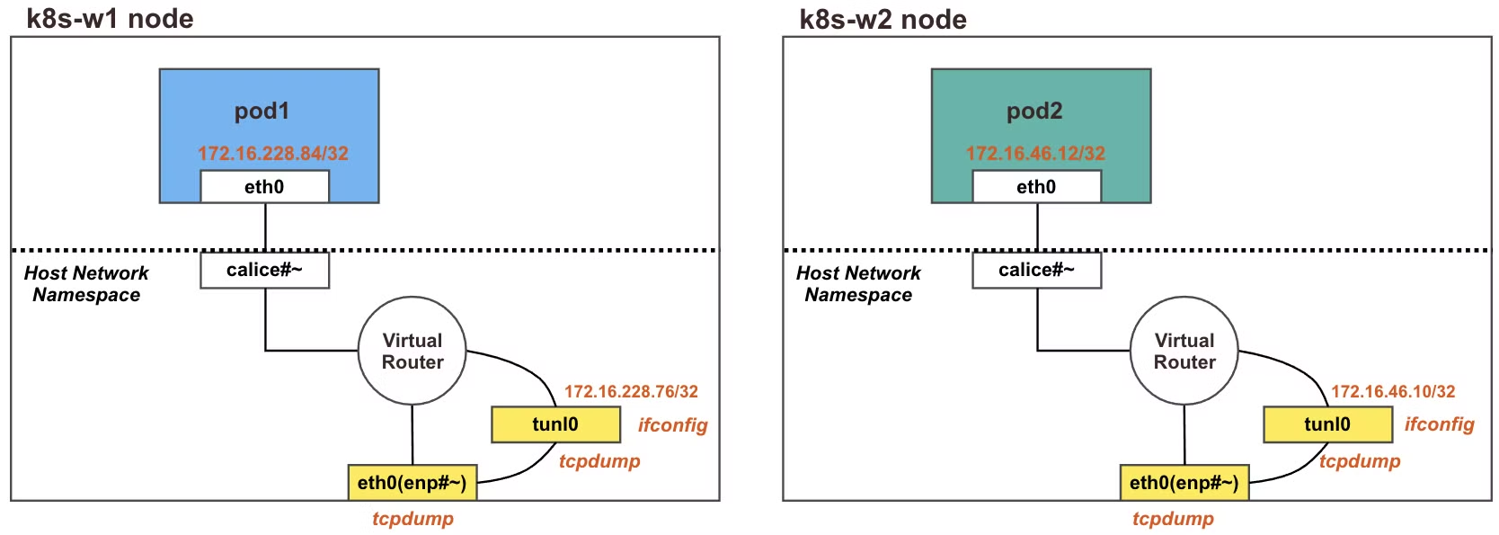 다른 노드 간의 Pod 통신은 tunl0 인터페이스를 통해 IP 헤더에 감싸져 상대 노드로 전달되고, 상대 노드의 tunl0 인터페이스에서 Outer 헤더를 제거하고 내부 Pod와 통신하는 구조입니다.