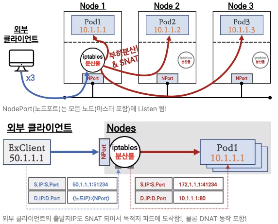 NodePort를 이용하여 외부와 통신하려면 클러스터 내부의 노드 IP, Port를 외부로 노출해야 하기 때문에 보안에 취약합니다. 또한 클라이언트 IP 보존을 위해서, externalTrafficPolicy: local를 사용하게 되면 파드가 없는 노드 IP로 NodePort 접속 시 실패하게 됩니다.