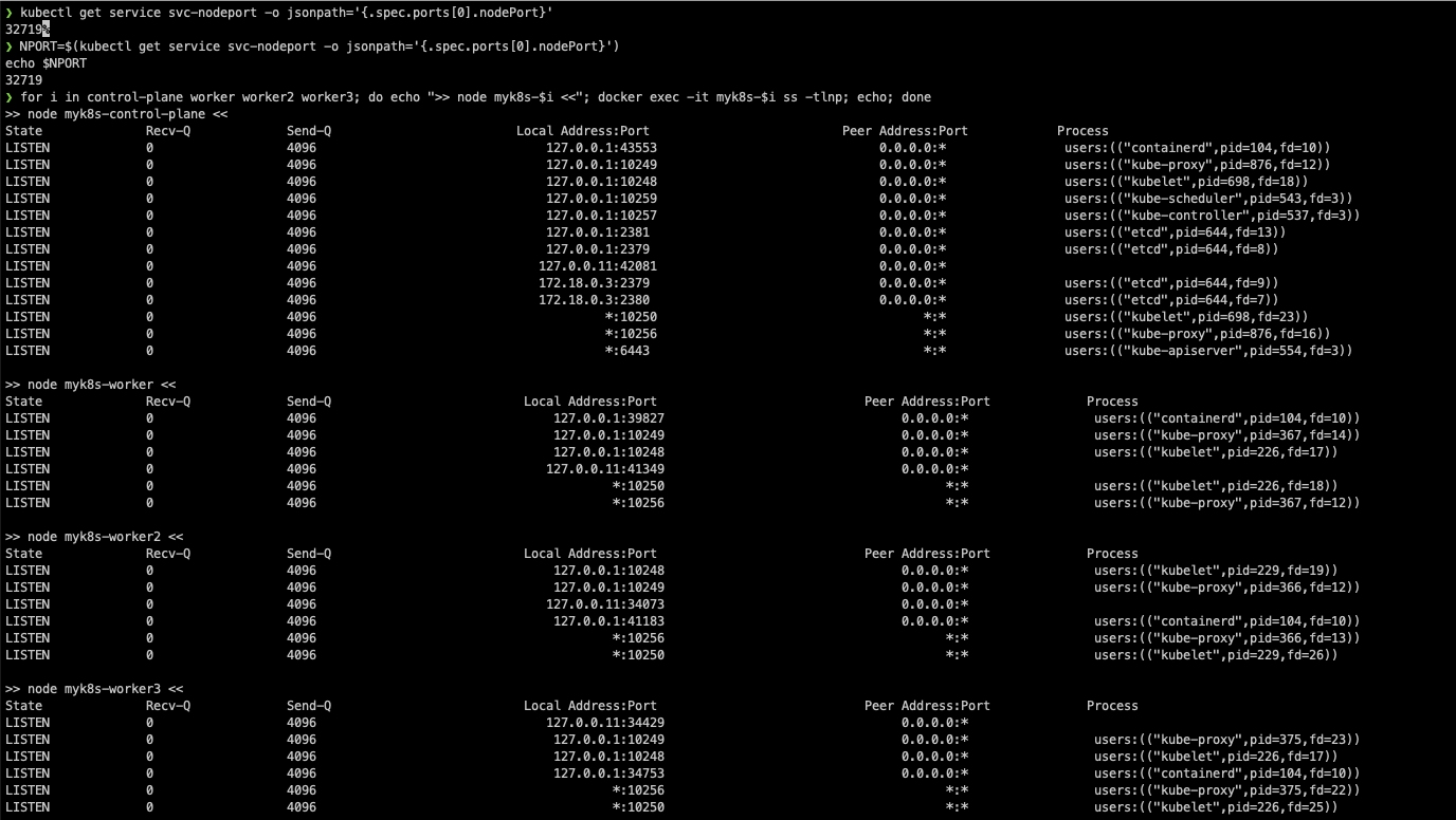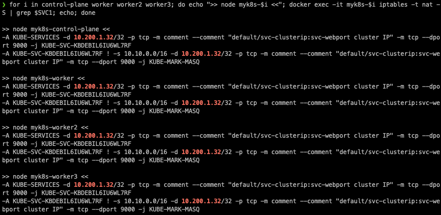 for i in worker worker2 worker3; do echo ">> node myk8s-$i <<"; docker exec -it myk8s-$i sh -c 'apt update && apt install tree psmisc lsof wget bridge-utils net-tools ipset ipvsadm nfacct tcpdump ngrep iputils-ping arping -y'; echo; done