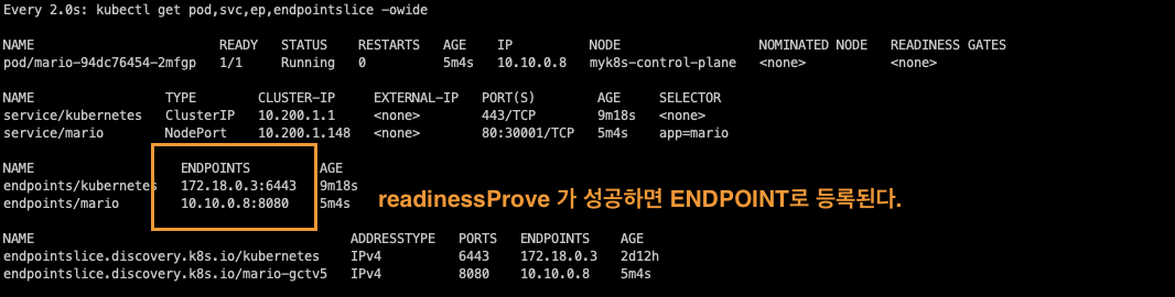 Pod에 원격접속하여 ReadinessProve의 조건을 만족시키면, 다음과 같이 ENDPOINT가 등록됩니다.