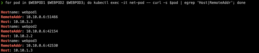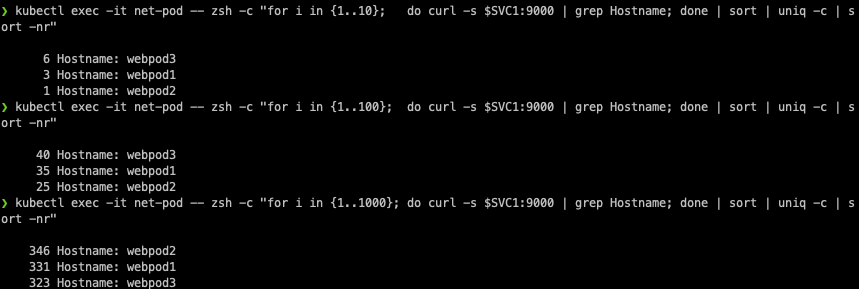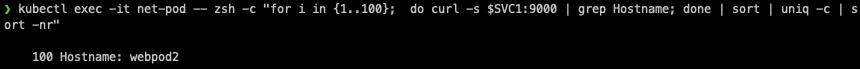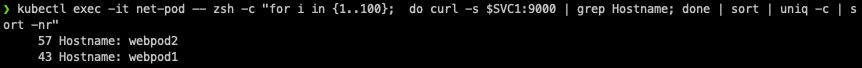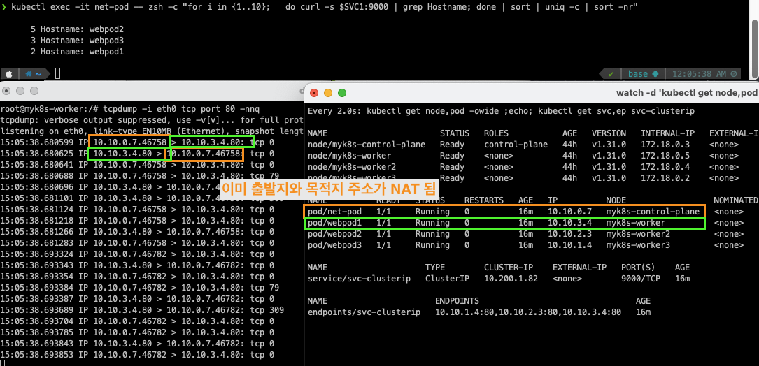# 실습 환경에서는 아래처럼 2개의 파드 중 자신의 노드에 생성된 파드 1개만 DNAT 연결됨