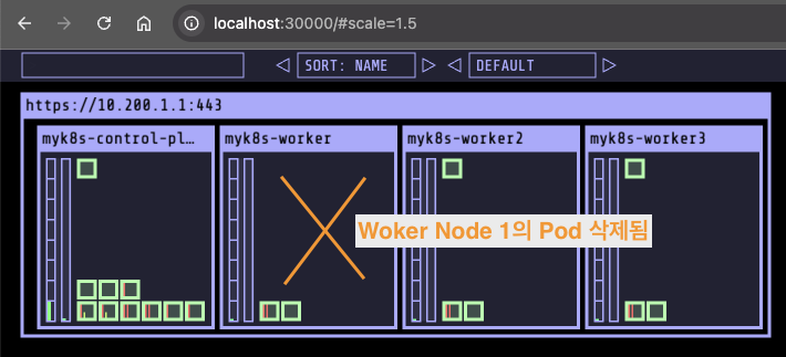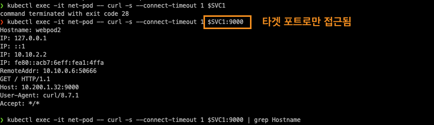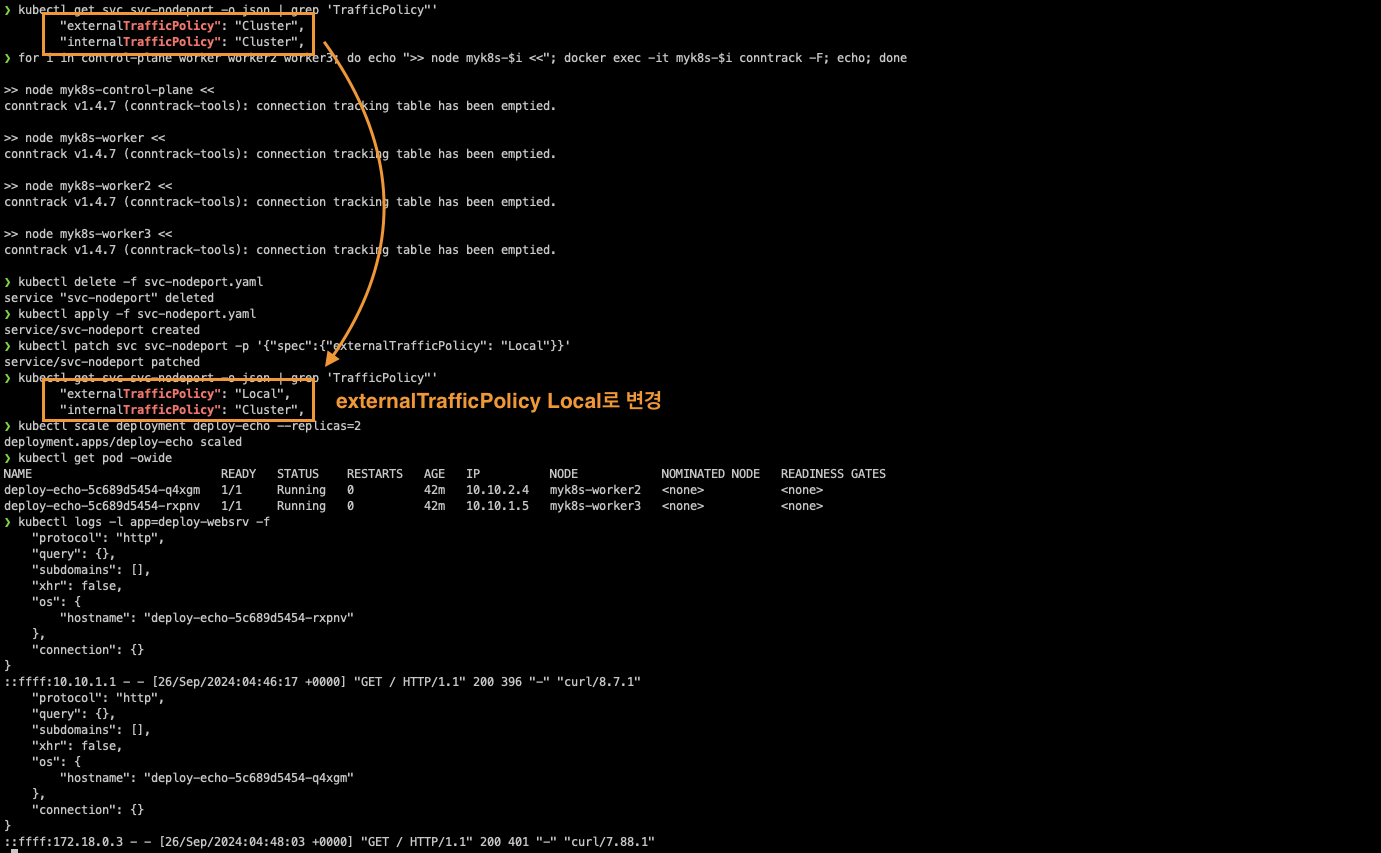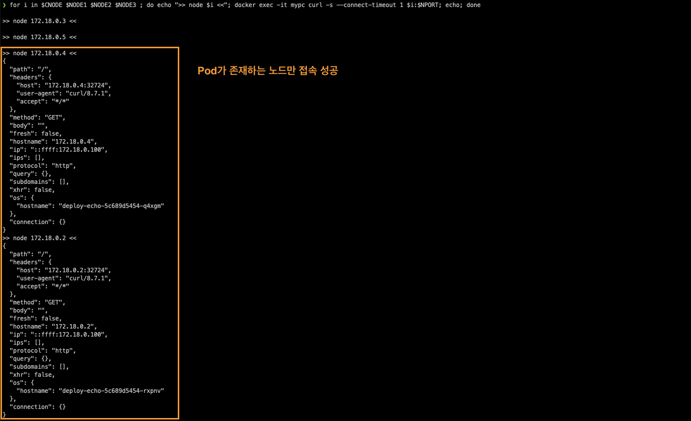 # 서비스(NodePort) 부하분산 접속 확인 : 파드가 존재하지 않는 노드로는 접속 실패!, 파드가 존재하는 노드는 접속 성공 및 클라이언트 IP 확인!