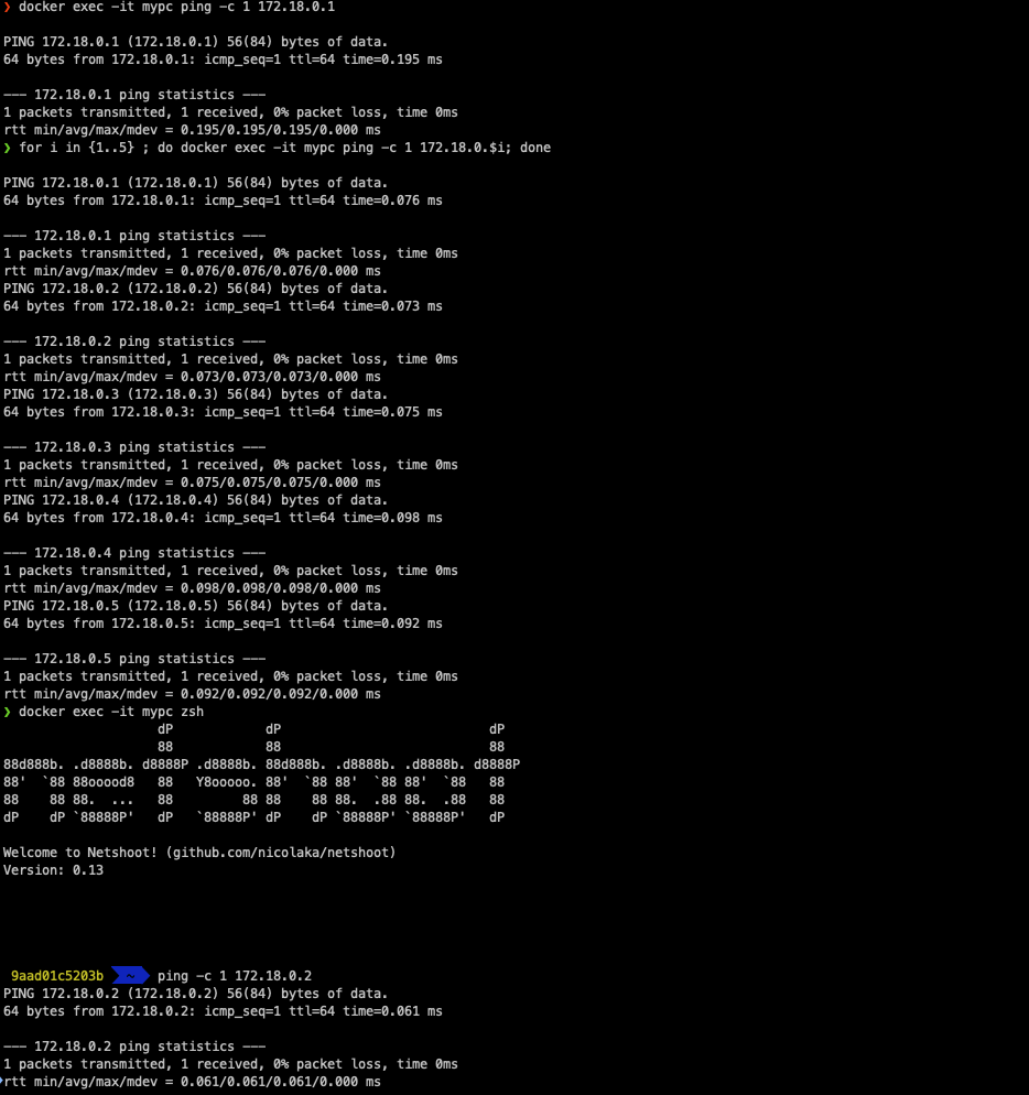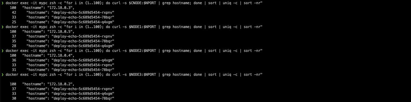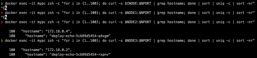 for i in $CNODE $NODE1 $NODE2 $NODE3 ; do echo ">> node $i <<"; docker exec -it mypc curl -s --connect-timeout 1 $i:$NPORT; echo; done