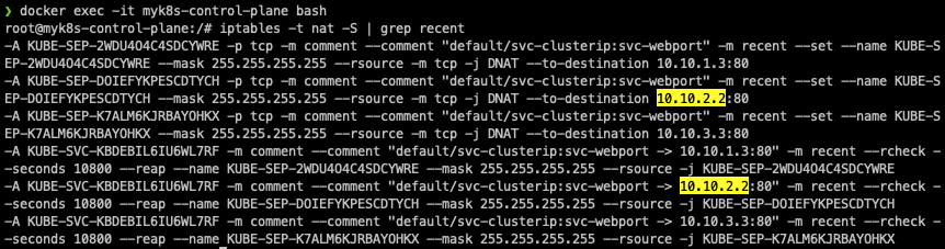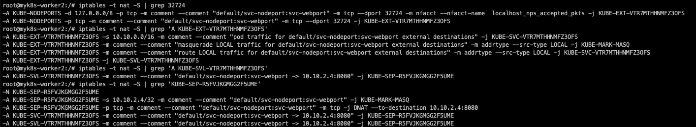 -A KUBE-SEP-FBJG45W6XHLV2NA6 -p tcp -m comment --comment "default/svc-nodeport:svc-webport" -m tcp -j DNAT --to-destination 10.10.2.7:8080