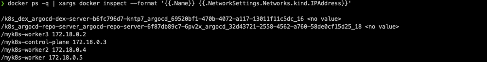docker ps -q | xargs docker inspect --format '{{.Name}} {{.NetworkSettings.Networks.kind.IPAddress}}'