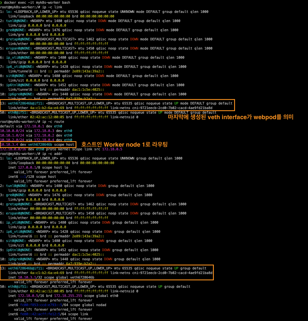 for i in control-plane worker worker2 worker3; do echo ">> node myk8s-$i <<"; docker exec -it myk8s-$i ip -c addr; echo; done