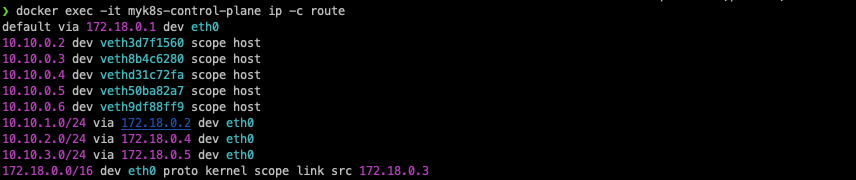 for i in control-plane worker worker2 worker3; do echo ">> node myk8s-$i <<"; docker exec -it myk8s-$i ip -c route; echo; done