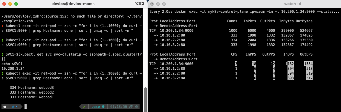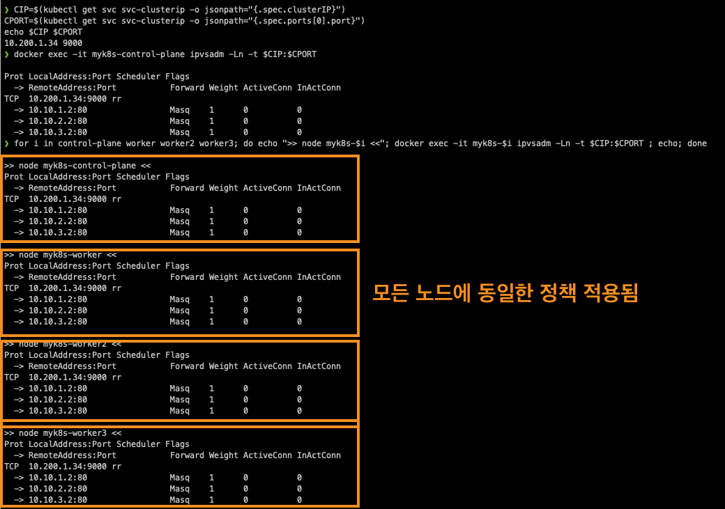 for i in control-plane worker worker2 worker3; do echo ">> node myk8s-$i <<"; docker exec -it myk8s-$i ipvsadm -Ln ; echo; done