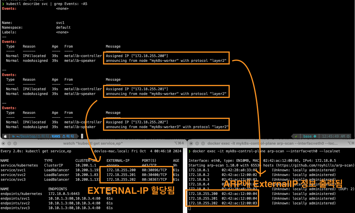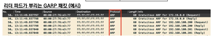 LoadBalancer 서비스 리소스 생성시 MetalLB 스피커 파드들 중 Leader 스피커 파드가 선출됩니다. 리더 스피커파드는 해당 LoadBalancer서비스의 External IP를 전파합니다. Layer2모드 이기 때문에 ARP 메시지를 이용하여 동일 네트워크 대역내에 브로드캐스트 주소로 전파합니다. 리더 스피커 파드가 장애 발생시, 나머지 스피커 파드 중 리더가 다시 선택됩니다.