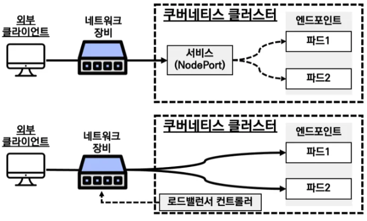 첫 번째 방식은 노드의 NodePort를 로드밸런서로 연결하여 부하분산을 구성하는 방법인데, 이때는 부하분산과정이 두번 수행하기 때문에 비효율 적입니다.