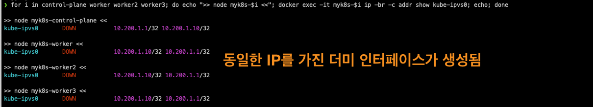 for i in control-plane worker worker2 worker3; do echo ">> node myk8s-$i <<"; docker exec -it myk8s-$i ip -br -c addr show kube-ipvs0; echo; done