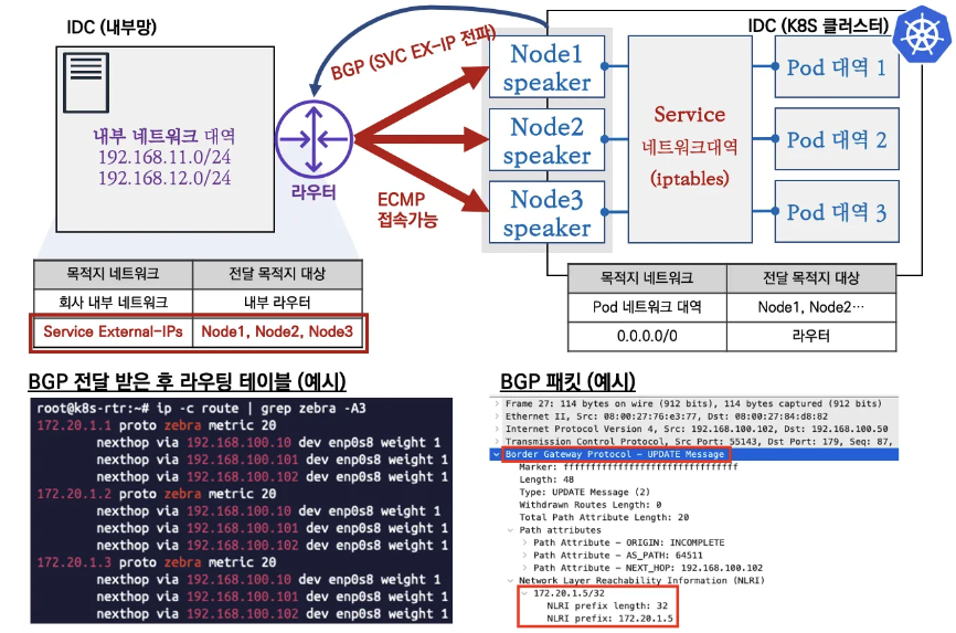 BGP 모드는 각 노드의 speaker 파드가 BGP로 서비스 정보(EXTERNAL-IP)를 전파 후, 외부에서 라우터를 통해 ECMP 라우팅으로 부하 분산 접속을 하게 됩니다. Service External IPs는 외부에서 접근할 수 있는 서비스 IP들이 표시됩니다. 라우터에서는 이러한 IP 주소를 통해 Node1, Node2, Node3와 같은 클러스터로 트래픽을 분산하여 처리합니다.
