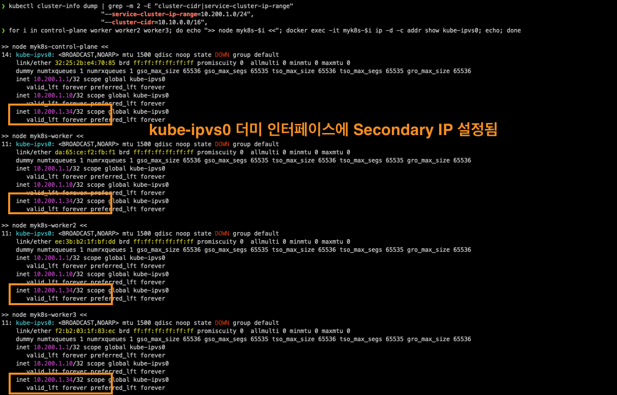 # kube-ipvs0 에 할당된 IP(기본 IP + 보조 IP들) 정보 확인
