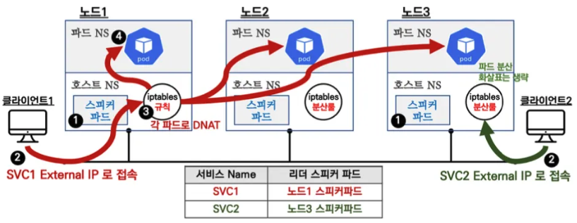 클라이언트가 SVC의 External IP로 접속을 시도하게 되면, 리더 스피커 파드가 있는 노드로 들어오고, iptables의 규칙에 의해 여러 Pod들로 부하분산되는 형태입니다.